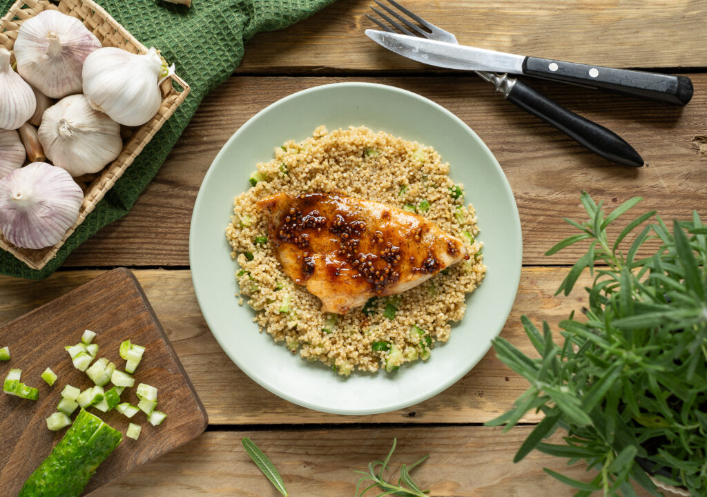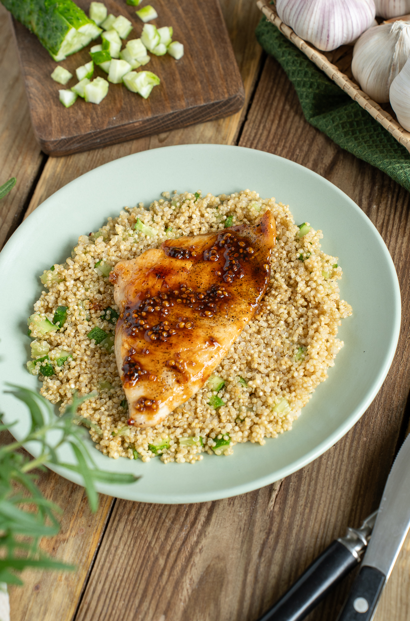 Labiausiai tiks šviežias, o ne džiovintas rozmarinas, tada jo skonis intensyvesnis. Tokia vištiena tiks ir su įvairiais kitais garnyrais, o kynva bus kaip tik, kai norisi lengvesnių ar sveikesnių pietų/vakarienės.